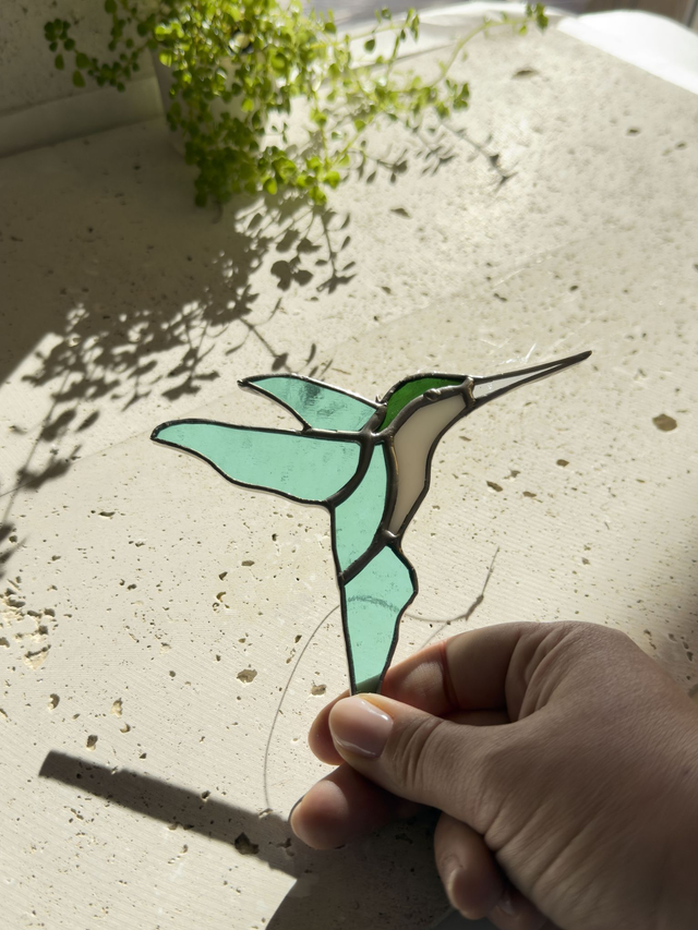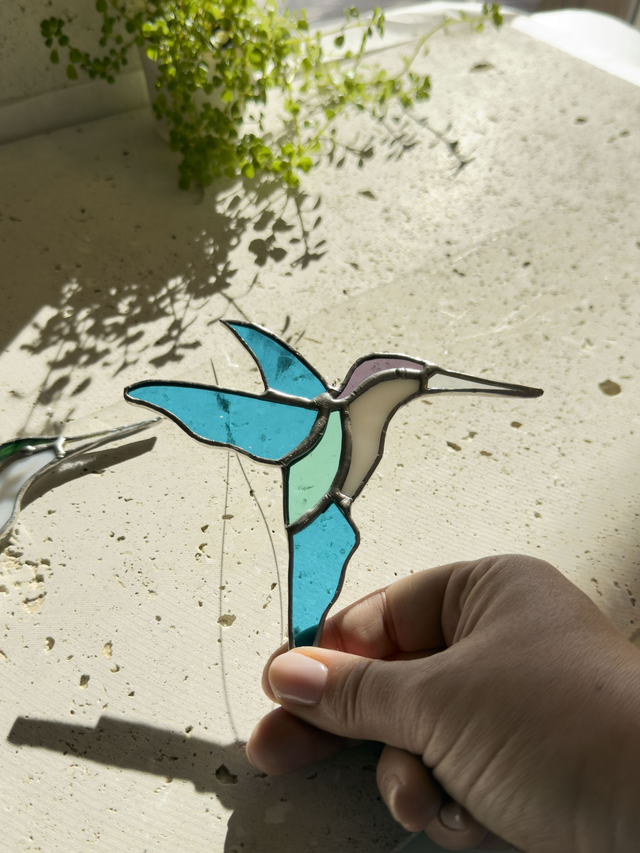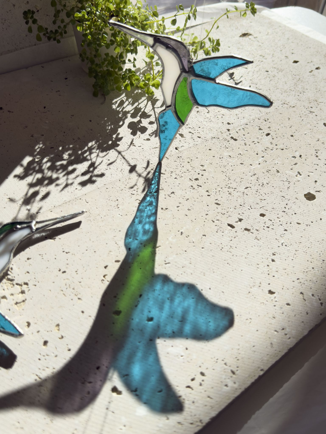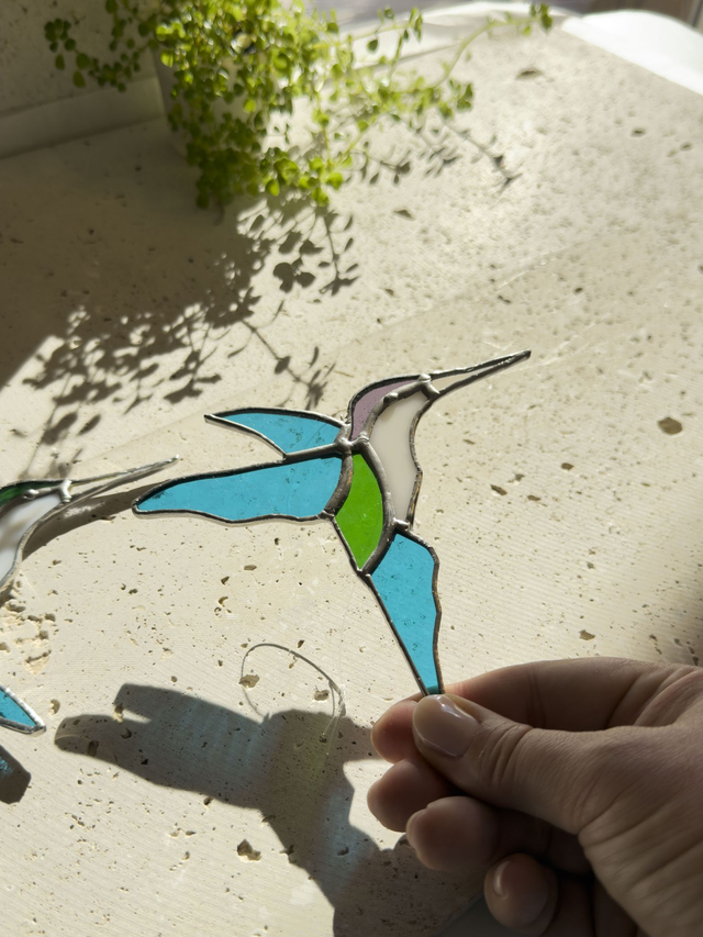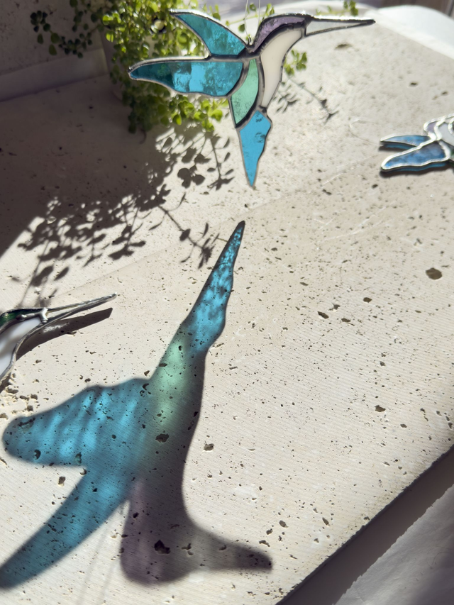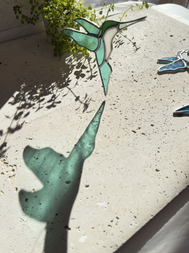 Inspiré des colibris croisés en Californie, ce vitrail capture leur légèreté et leurs couleurs vibrantes. Une pièce lumineuse qui danse au soleil et apporte une touche poétique à votre intérieur.